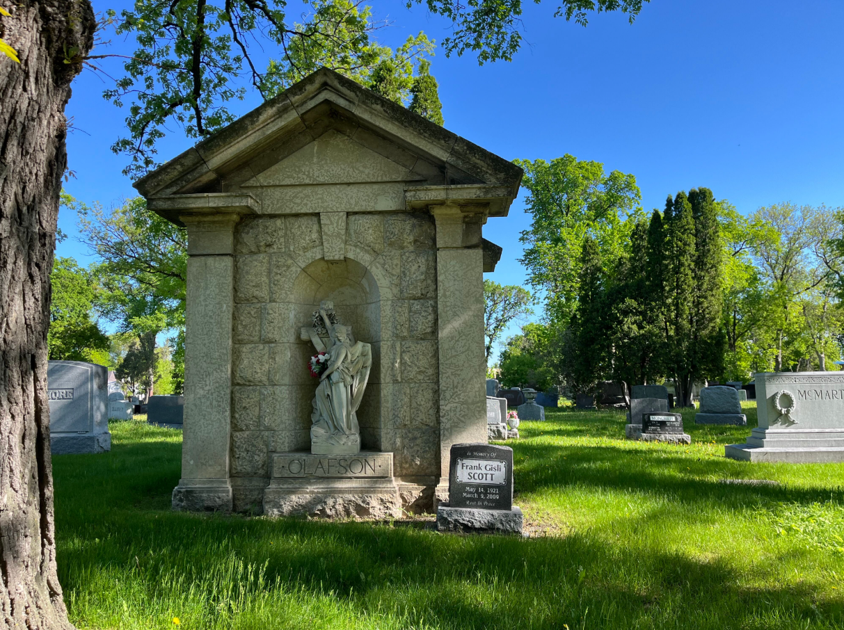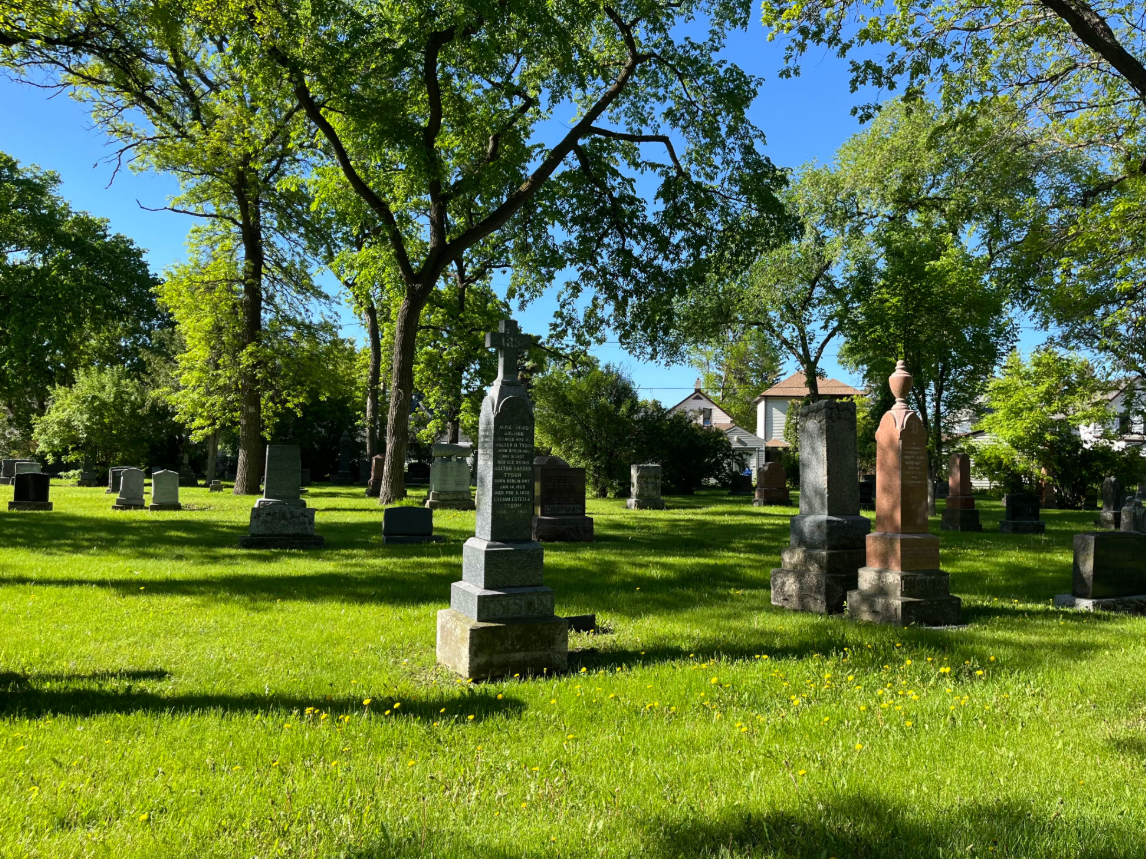 Manitoba’s first entirely non-denominational cemetery, this is the final resting place for many prominent people and a special place for the neighborhood. Mr. Frank H. Nutter, a prominent landscape engineer of Minneapolis, Minnesota, designed the cemetery. The plans called for a number of winding gravel avenues interspersed with park-like spaces and a large space reserved in the centre for a mortuary chapel and receiving tomb. Magnificent old elm trees dot the landscape of this beautifully restored cemetery. It is run as a non-profit organization by the Friends of Elmwood Cemetery. Well-maintained, peaceful and park-like, it is a very popular place for walking, jogging and biking.
